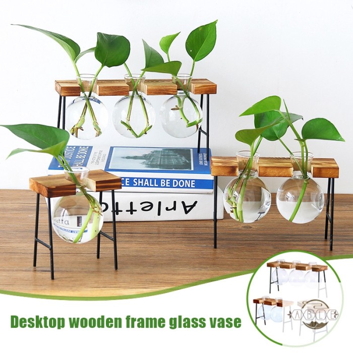 Vintage Creative Transparent Glass Vase Wooden Frame Hydroponic Plant Bonsai Coffee Shop Tablet Shopee Indonesia